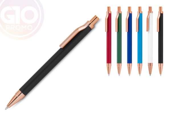 Caneta metálica personalizada, caneta esferográfica com corpo em alumínio reciclado, acionador e clipe em acabamento rosé/bronze. 1 gravação a laser já incluso.