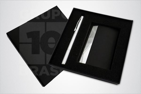 Kit executivo com 2 peças, estojo de papelão resistente. Conteúdo do Kit: 1 Porta Cartão e 1 Caneta Metal com Laser e Lanterna. Uma gravação já inclusa.