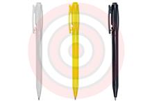 Caneta plástica inteira colorida. Possui detalhes em relevo na parte superior ao redor do clip, parte inferior com detalhes em relevo. Aciona por clique e para destravar basta apertar a parte inferior do clip. Gravação em 1 cor já incluso.